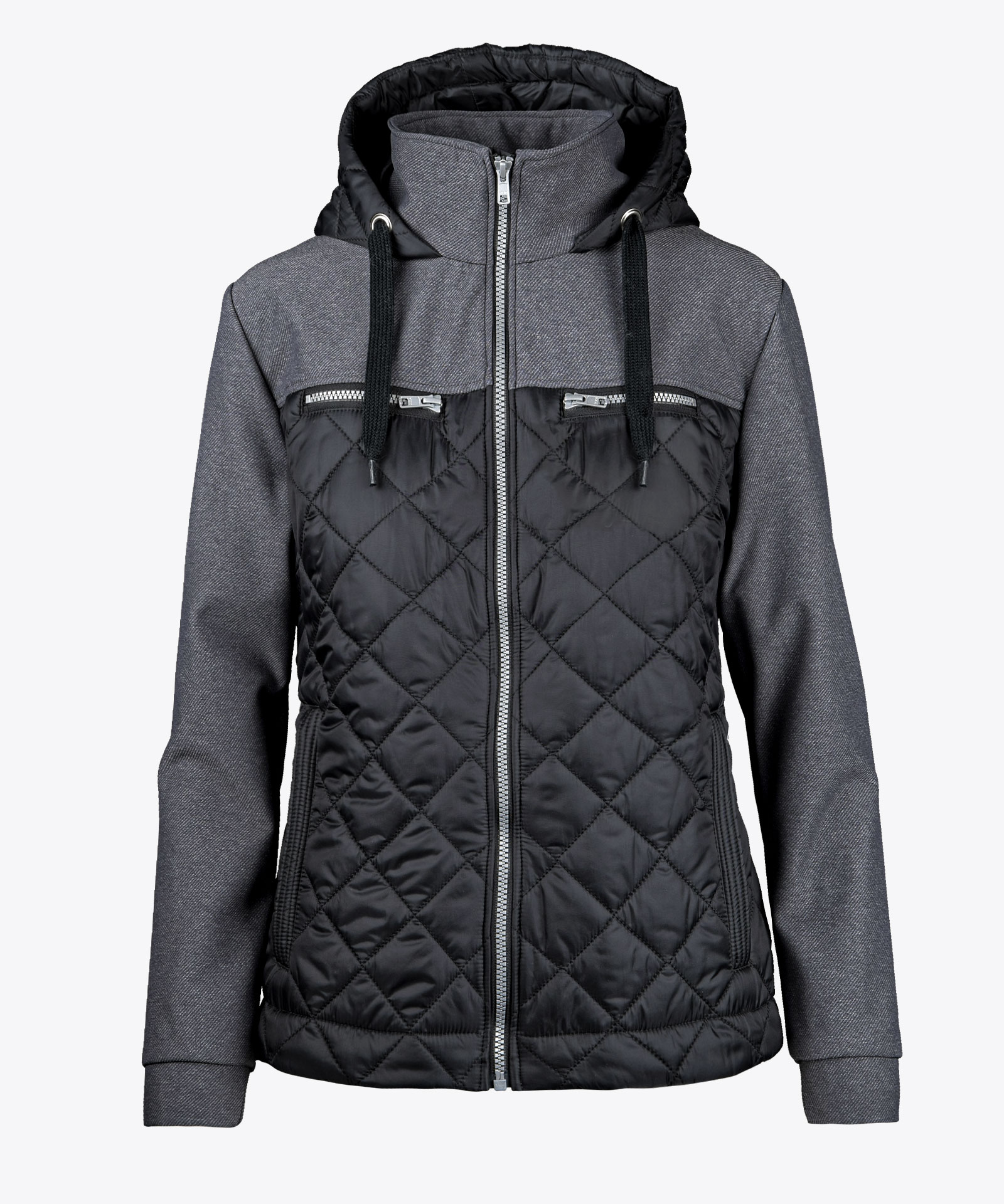 Gerade geschnittene Leicht-Steppjacke in Rautenstepp-Design; mit Kontrastmaterial in meliertem Twill-Softshell; Fleeceinnenseite; metallischer Farbeffekt an Frontzipp und quer liegenden Brusttaschenzipps; zusätzlich seitliche Zipptaschen-Eingriffe; Ärmelabschluss mit anliegender Bundverarbeitung; Jackensaum innen mit Gummikordel weitenregulierbar; angeschnittene Kapuze mit Kordelband; ungefüttert
