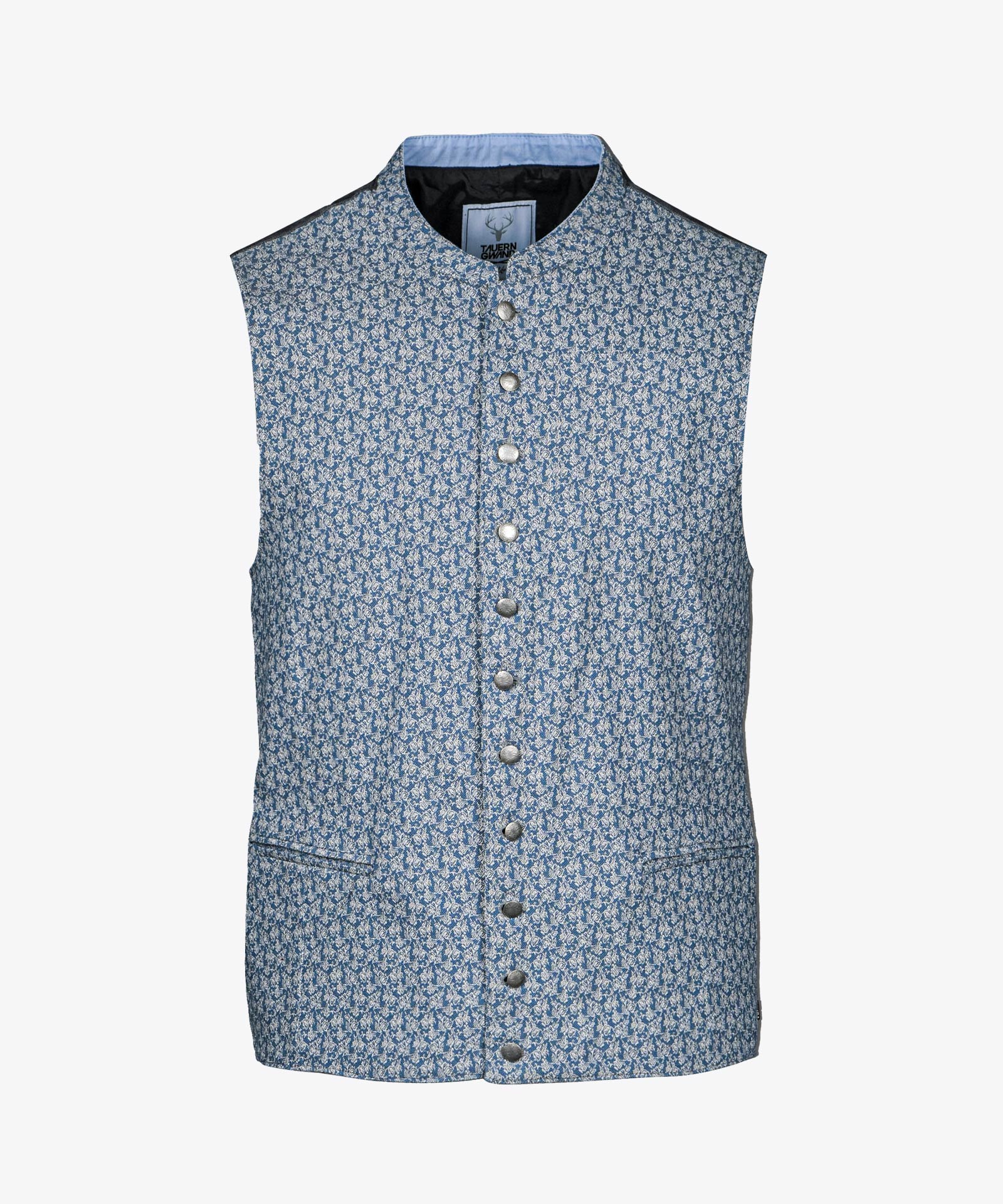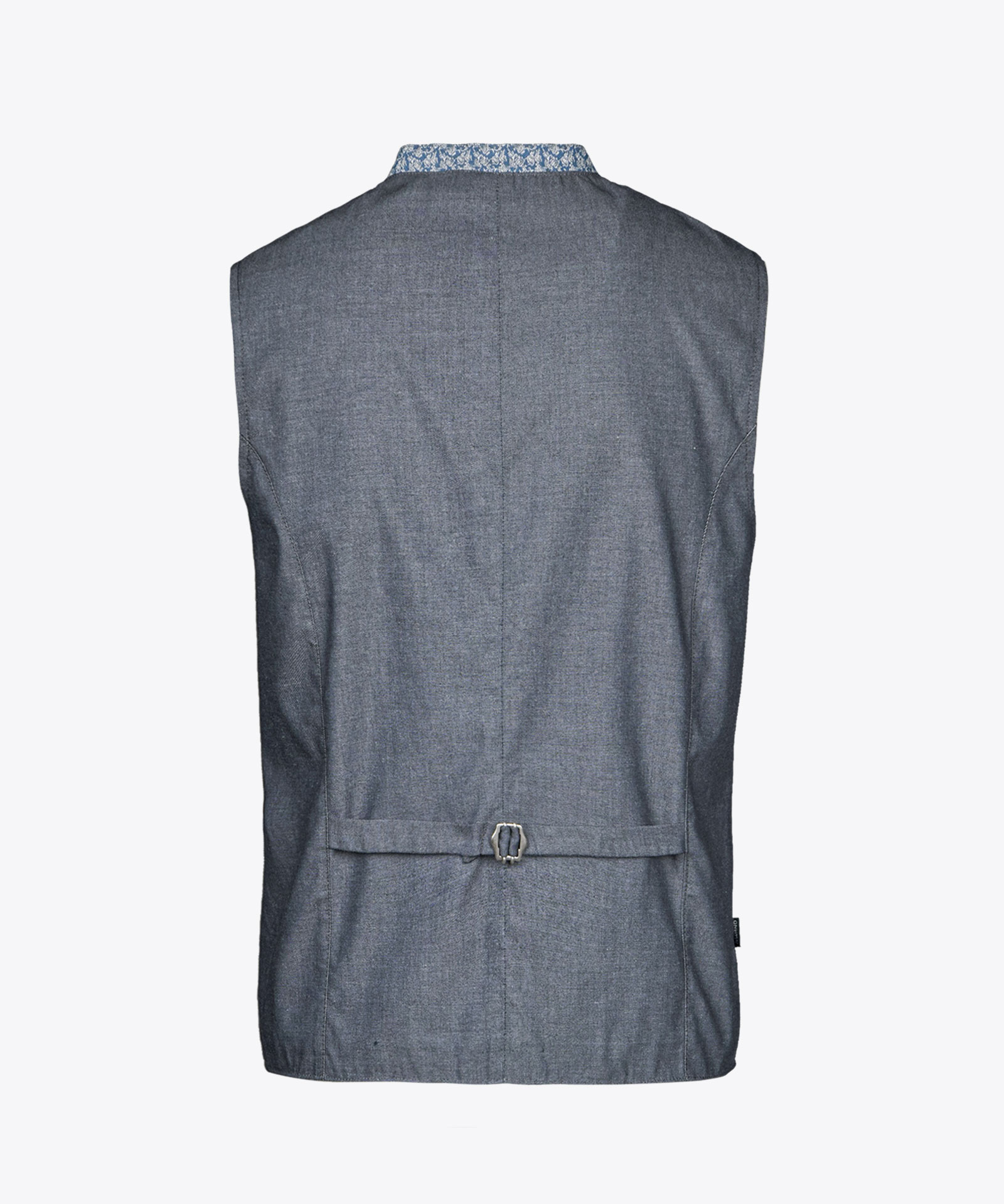 Westenmodell mit Jacquard-Webdesign; Rückenteil in fein meliertem Kontraststoff und mit verstellbarem Rückenriegel; kleiner Stehkragen in Kontraststoff innen; Metallknöpfe;