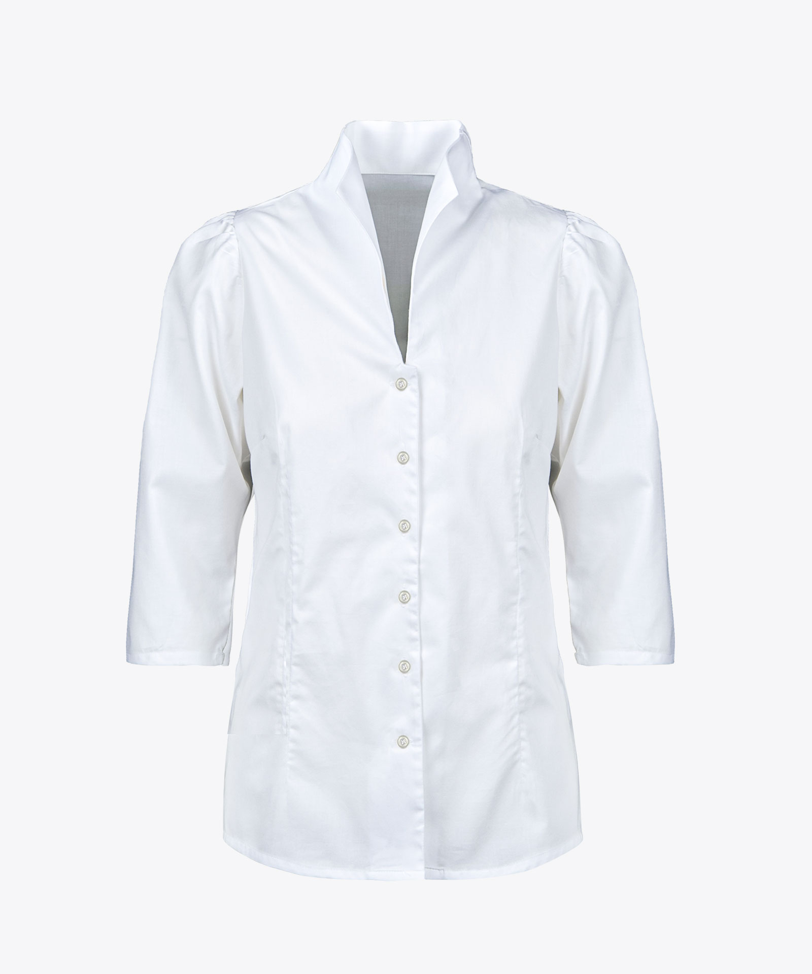 Bluse in bügelfreier Popelinqualität; in leicht taillierter Schnittform mit Kelchkragen; dezenter Puffärmel in Dreiviertelärmellänge Material: 98% Baumwolle, 2% Elasthan
