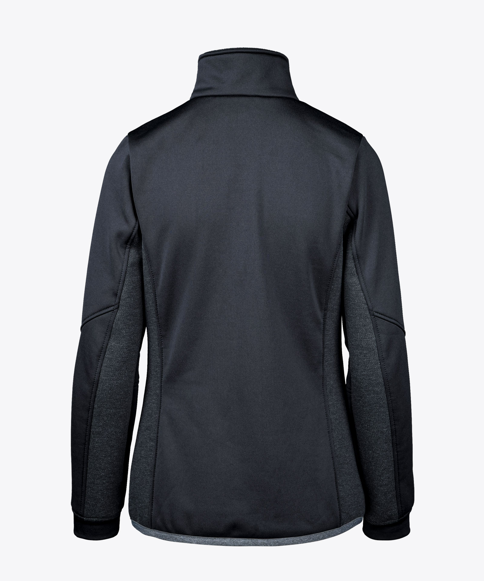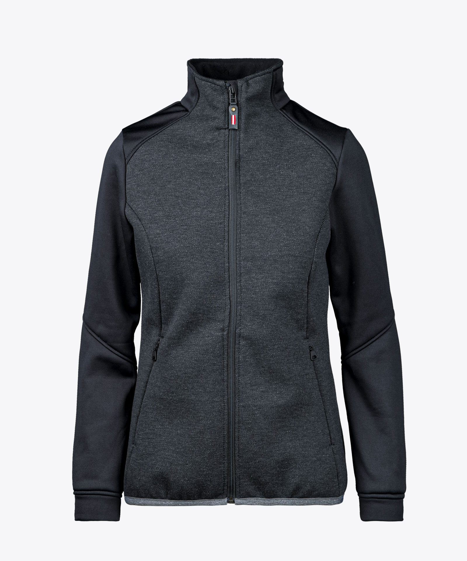 Figurbetonte hochelastische Midlayerjacke in Materialmix; Tauerntex® -Multilayer-Technologie mit hochelastischem Tecno-Stretch-Material kombiniert, Vorderteil und seitliche Einsätze an Body und Ärmeln in doppelseitiger Strickware in melierter Twill-Außenseite/Jersey-Rückseite; Tecno-Stretch hauptsächlich aus recycelten Fasern; mit glatter Außenseite und warmer angerauter Fleeceinnenseite, äußerst atmungsaktiv, formstabil, schneller Feuchtigkeitstransport; hochschließender Kragen mit kurzer Kragenzippleiste mit Kinnschutzfunktion in Lederimitat (Laserlogo möglich); zwei Nahtzipptaschen;