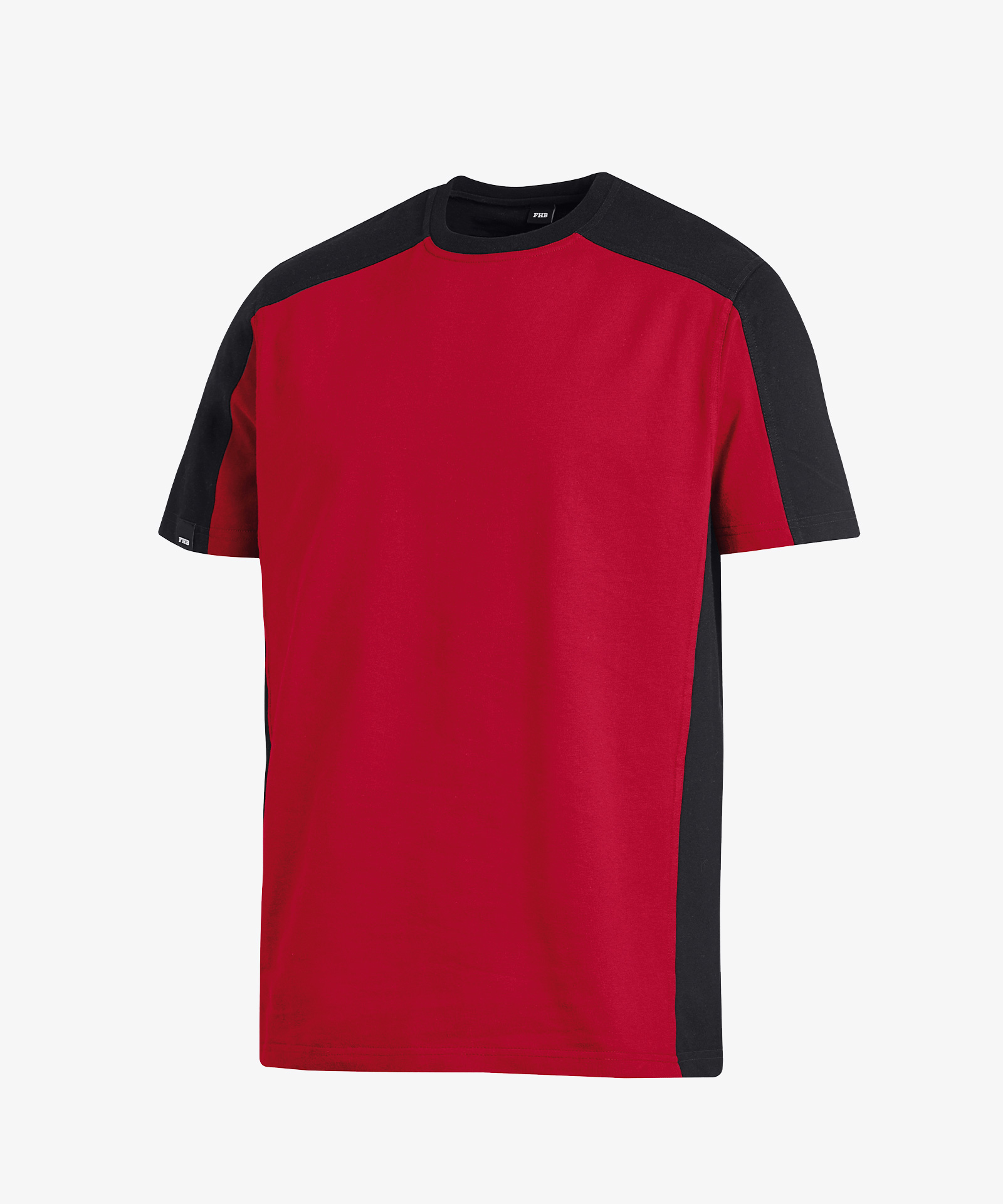 Rundhalsausschnitt mit Elasthan, Steppnähte am Hals-ausschnitt sowie Ärmel und Saum, Verstärkung durch Nackenband und Doppellage in Halbmondform, keine Schulternaht. Material: 100% Ringspinn-Baumwolle, 210g/m²