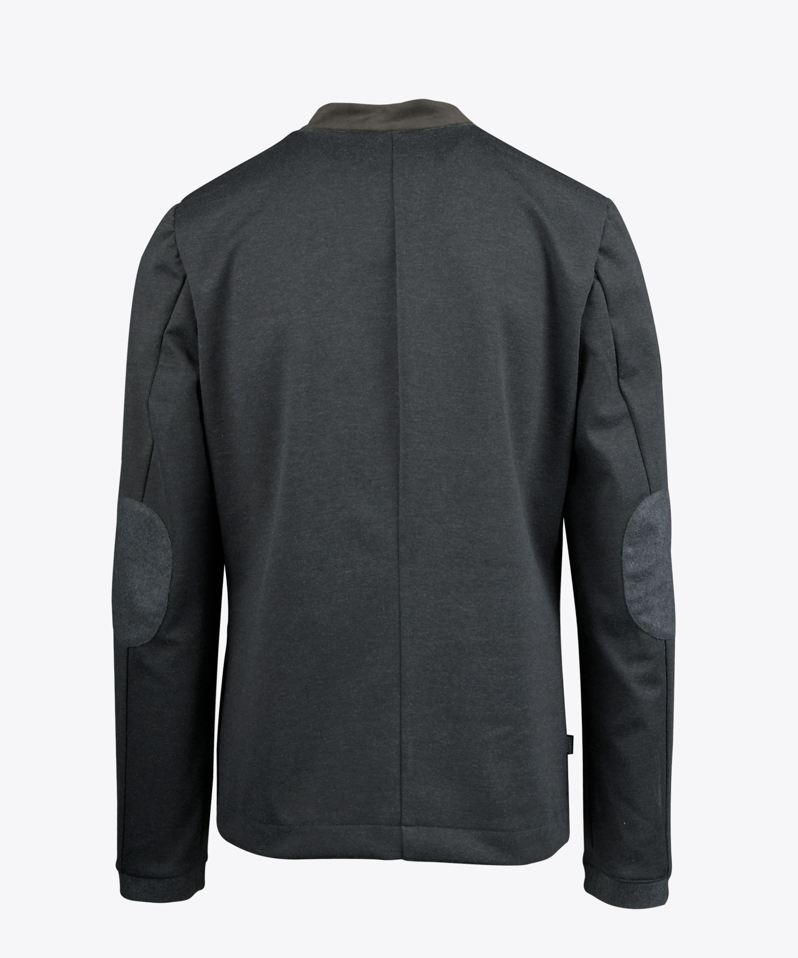 Hochgeschlossene Blazerjacke im Materialmix mit leicht elastischem meliertem Lodenstoff am Vorderteil und hochelastischer Wirkware an Rücken und Ärmeln; Samtstoff-Akzente an Stehkragen außen und Tascheneingriffen; Metallknopfverschluss; Vorderteil gefüttert