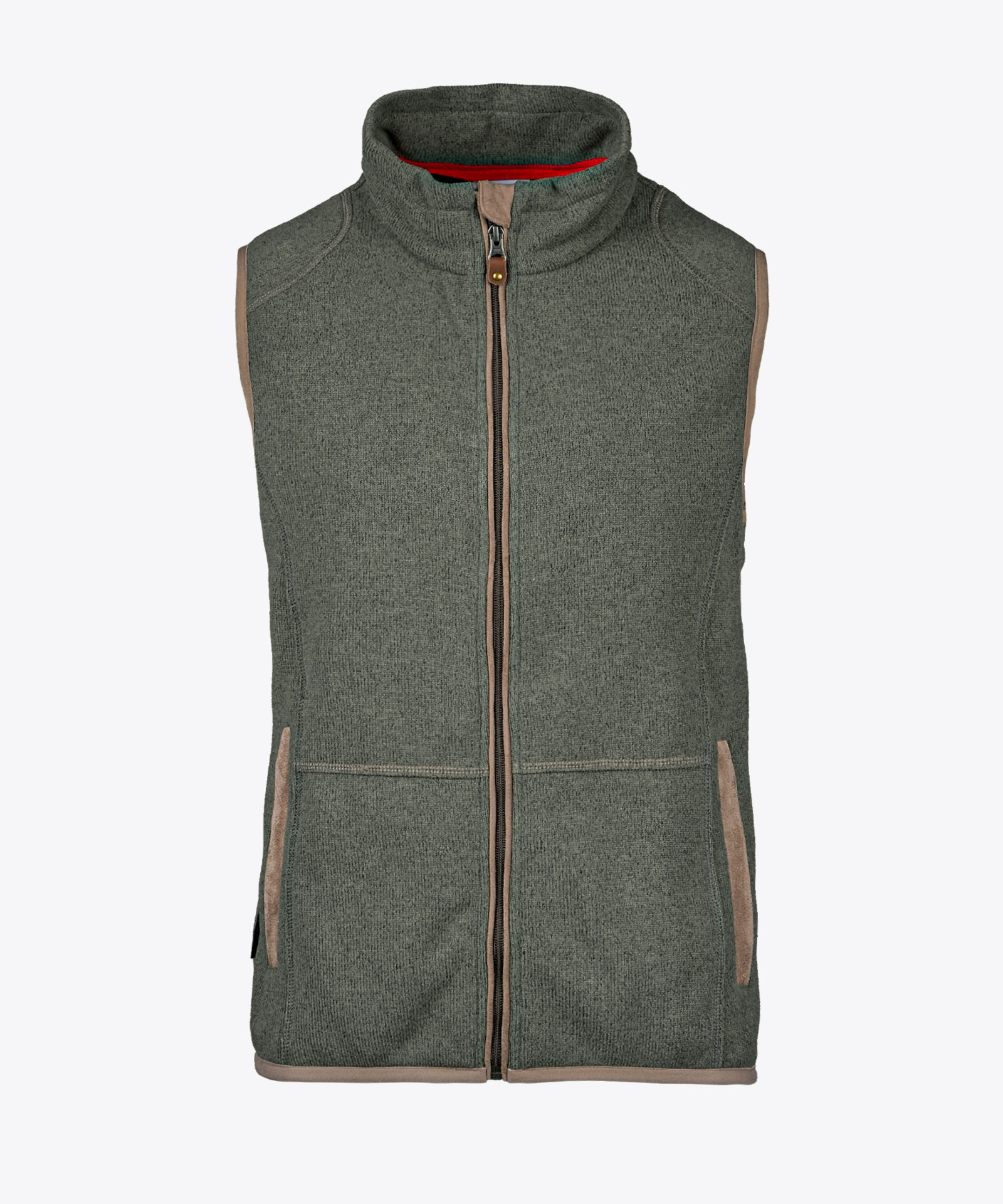 Strickfleeceweste aus Polartec® Thermal Pro® -Material mit aufgerauter Stoffinnenseite aus hauptsächlich recycelten Fasern; kontrastfarbene Veloursstoff-Details; Flachziernähte und Elastikeinfassung an Saum und Armabschluss; kurze Kragenzippleiste mit Kinnschutzfunktion in Lederimitat; zwei seitlich verdeckte Zipptaschen; Echtleder-Zippangreifer