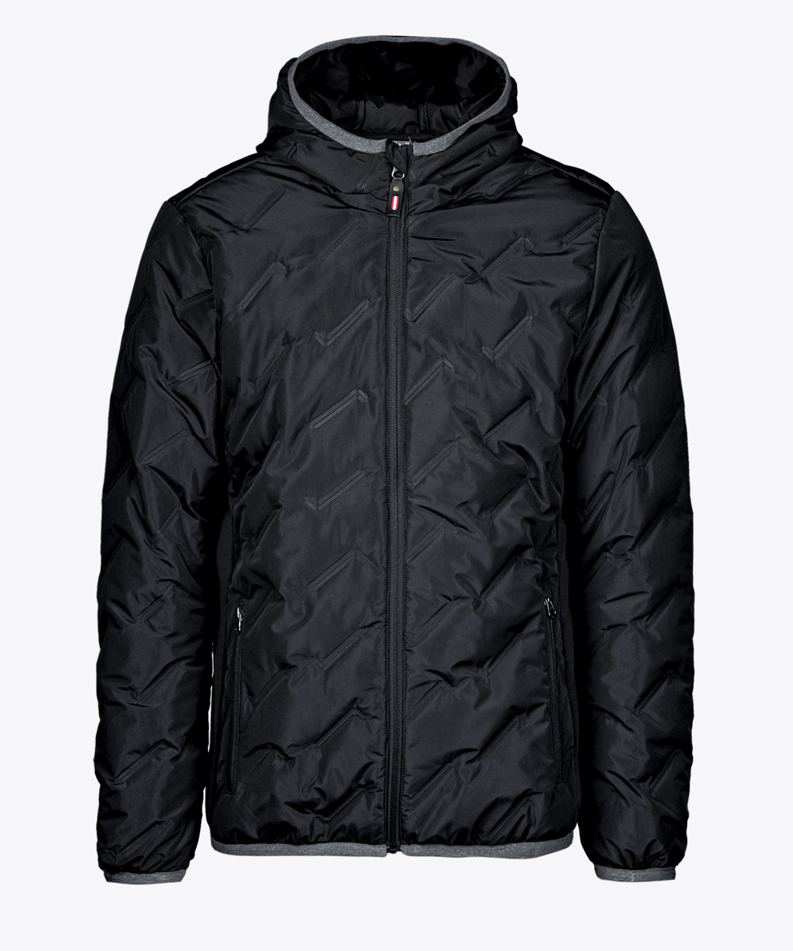 Leicht wattierte Jacke mit Steppeffekt; geschweißte Kammerkonstruktion mit Isolation aus Kunstfaser; seitliches Kontrastmaterial in bi-elastischer Knitshell-Qualität für Bewegungsfreiheit; angeschnittene Kapuze; Elastikeinfassung an Saum, Ärmelabschluss und an der Kapuzenöffnung; zwei Zipptaschen