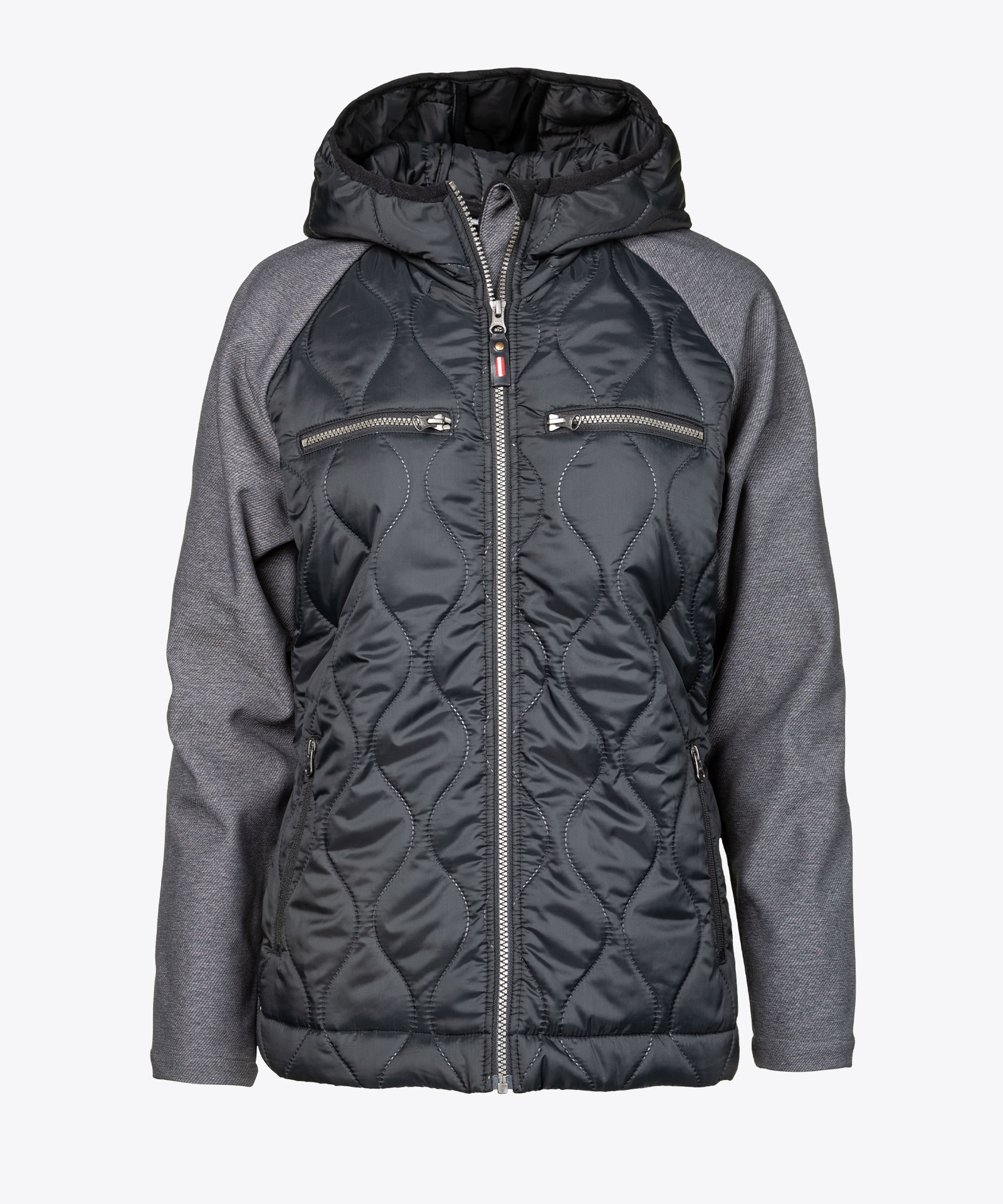 Gerade geschnittene leichte Steppjacke im Wellenstepp-Design, mit Kontrastmaterial aus meliertem recyceltem Twill-Softshell mit Innenfleece; Frontzipp mit Rot-Weiß-Rot Zipperpuller, quer liegende Brusttaschenzipper; seitliche Eingriffs-Zipptaschen im Vorderteil; Elastikeinfassung an der Kapuzenöffnung