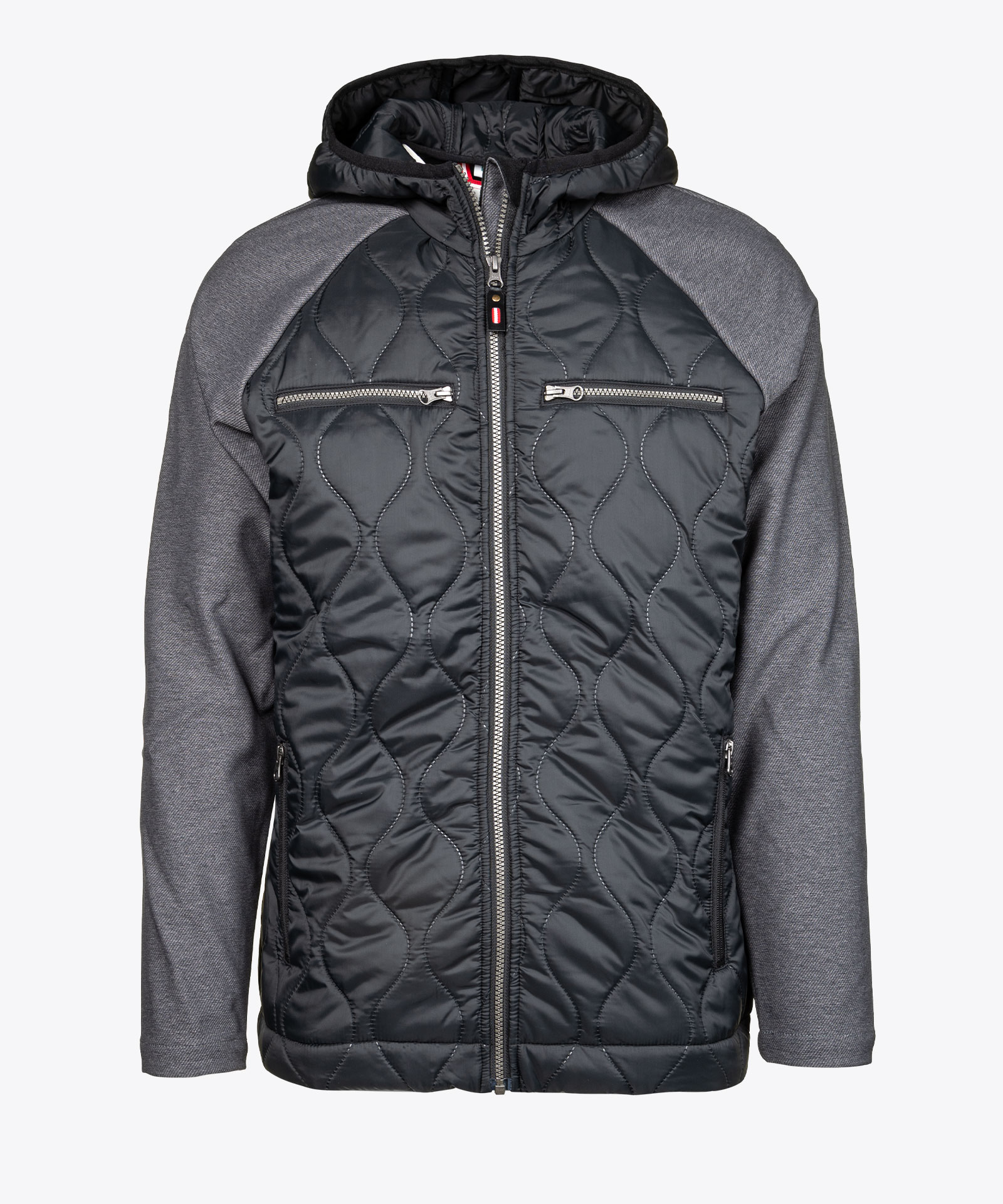 Gerade geschnittene leichte Steppjacke im Wellenstepp-Design, mit Kontrastmaterial aus meliertem recyceltem Twill-Softshell mit Innenfleece; Frontzipp mit Rot-Weiß-Rot Zipperpuller, quer liegende Brusttaschenzipper; seitliche Eingriffs-Zipptaschen im Vorderteil; Elastikeinfassung an der Kapuzenöffnung