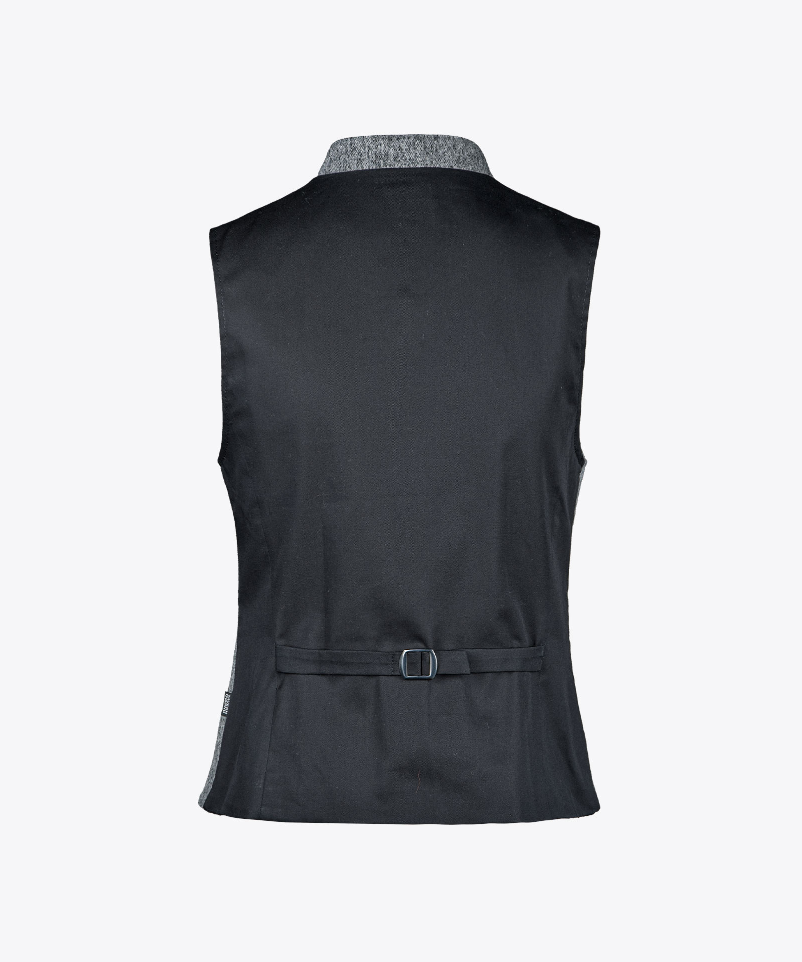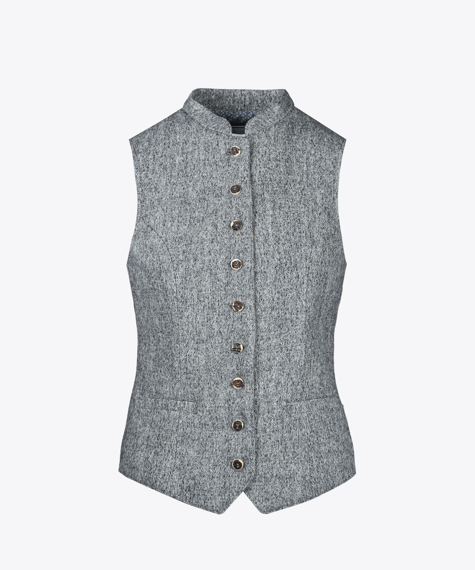 Wollgilet aus Schladminger Lodenstoff; kleiner Stehkragen; Rückenteil aus schwarzem Baumwollstoff und mit verstellbarem Rückenriegel; Beinknöpfe in Hirschhorn-Optik; zwei Leisteneingriffstaschen; Innenfutter bedruckt