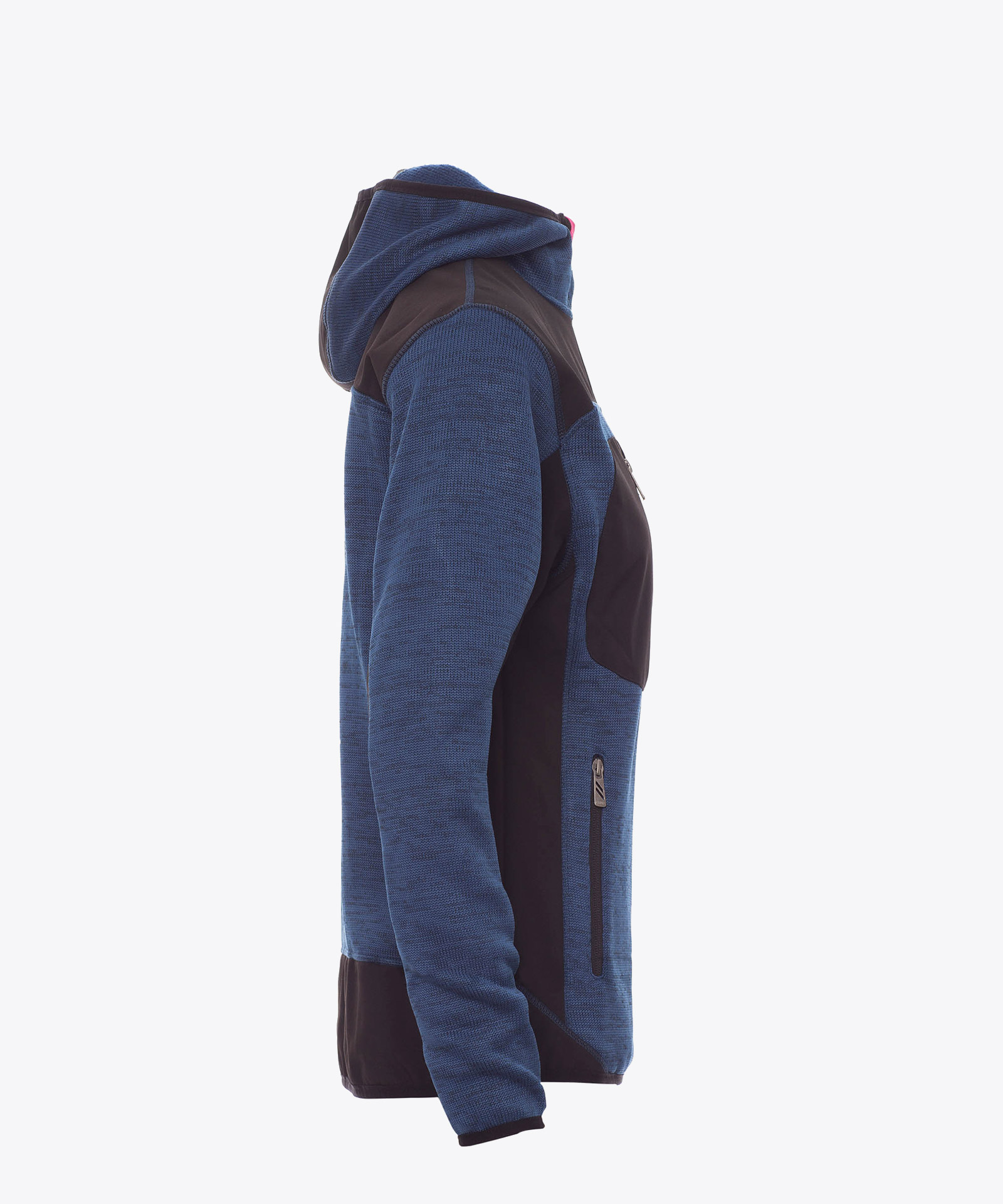 Technische Strickjacke mit schwarzen Softshell-Einsätzen, zweifarbig, versiegelter SBS-Reißverschluss, vorgeformter Kapuze mit zwei Nähten, feinem Saum an Handgelenk und Taille, zwei Seitentaschen mit