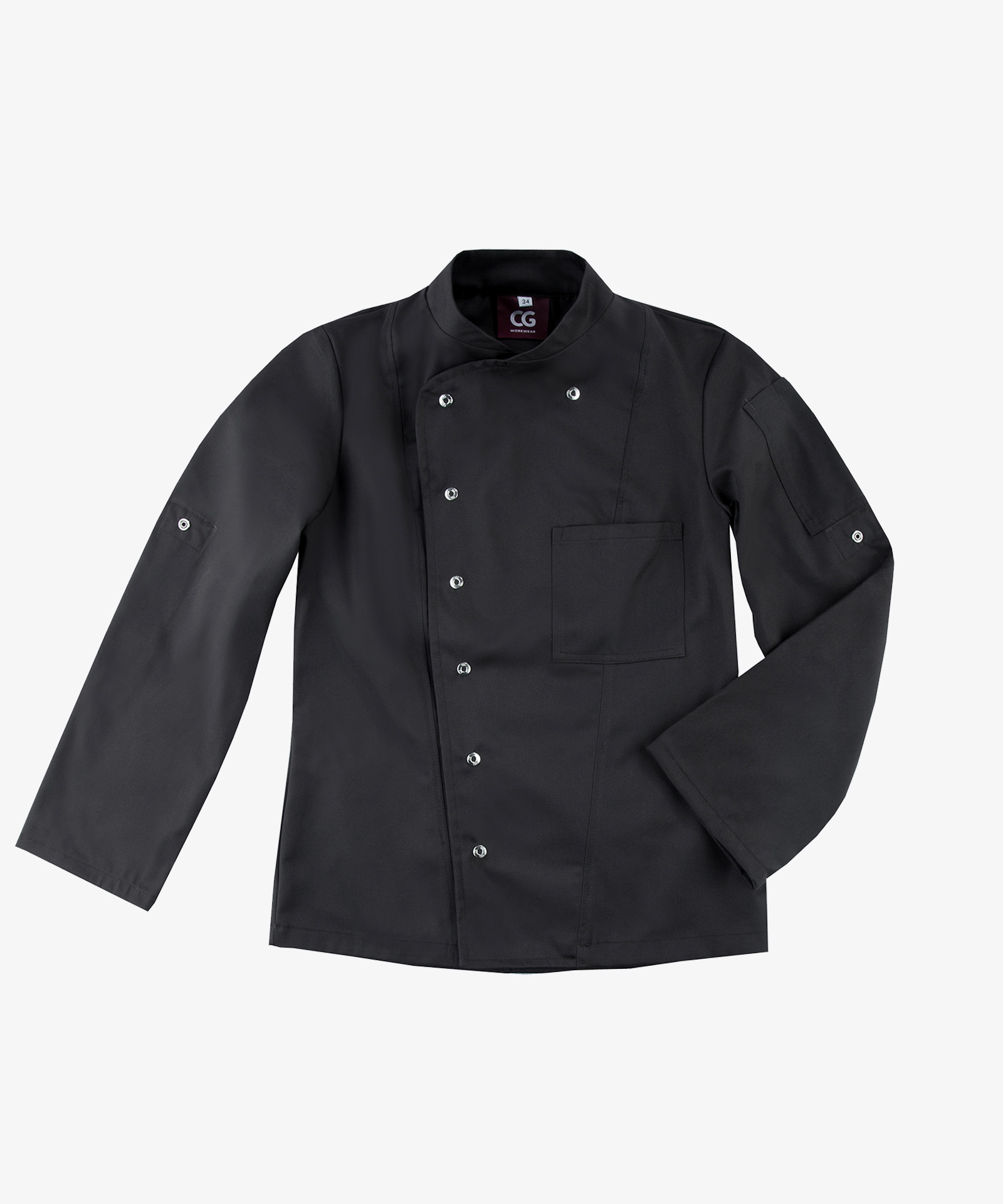 Moderne Kochjacke mit praktischen Druckknöpfen, Brust- und Ärmeltasche. Die Ärmel können aufgekrempelt und fixiert werden. Sehr strapazierfähig, knitterarm, pflegeleicht, farbecht, industriewäsche- und finishertauglich. Alle Farben bei 95° C waschbar für optimale Hygiene und gepflegtes Aussehen.
