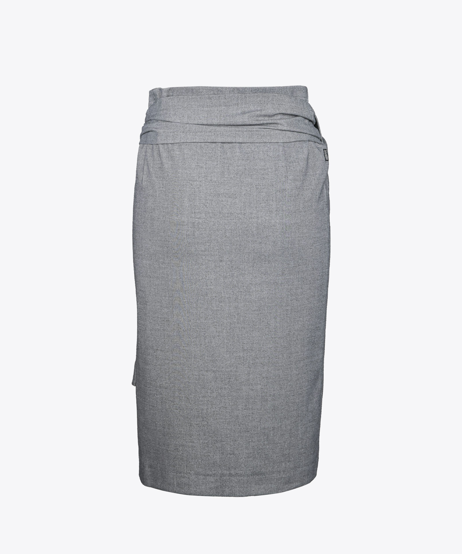 Asymmetrischer Wickelrock aus waschbaren Twill; variable Weitenregulierung durch seitliches Binden; Länge knieumspielend; ungefüttert