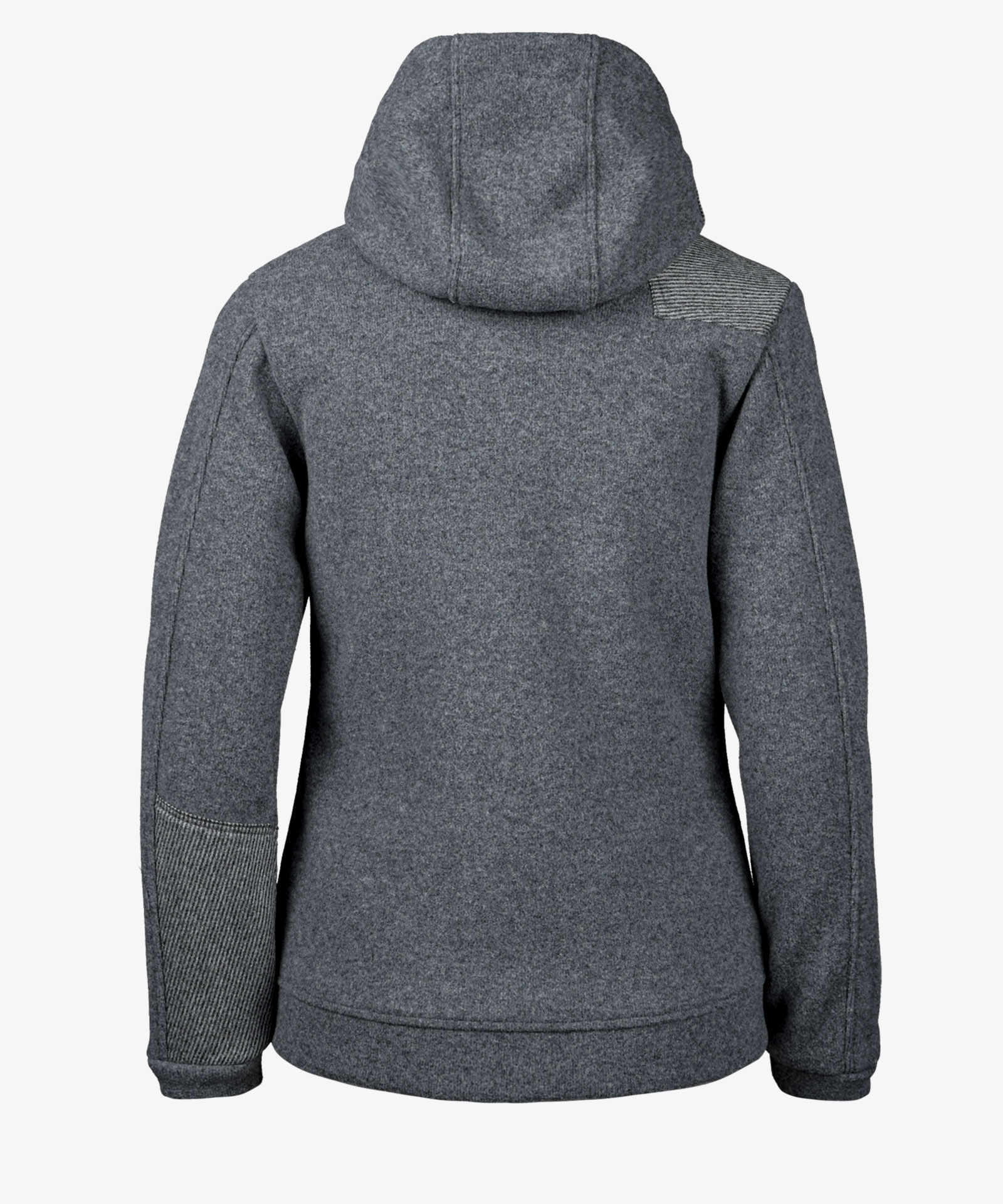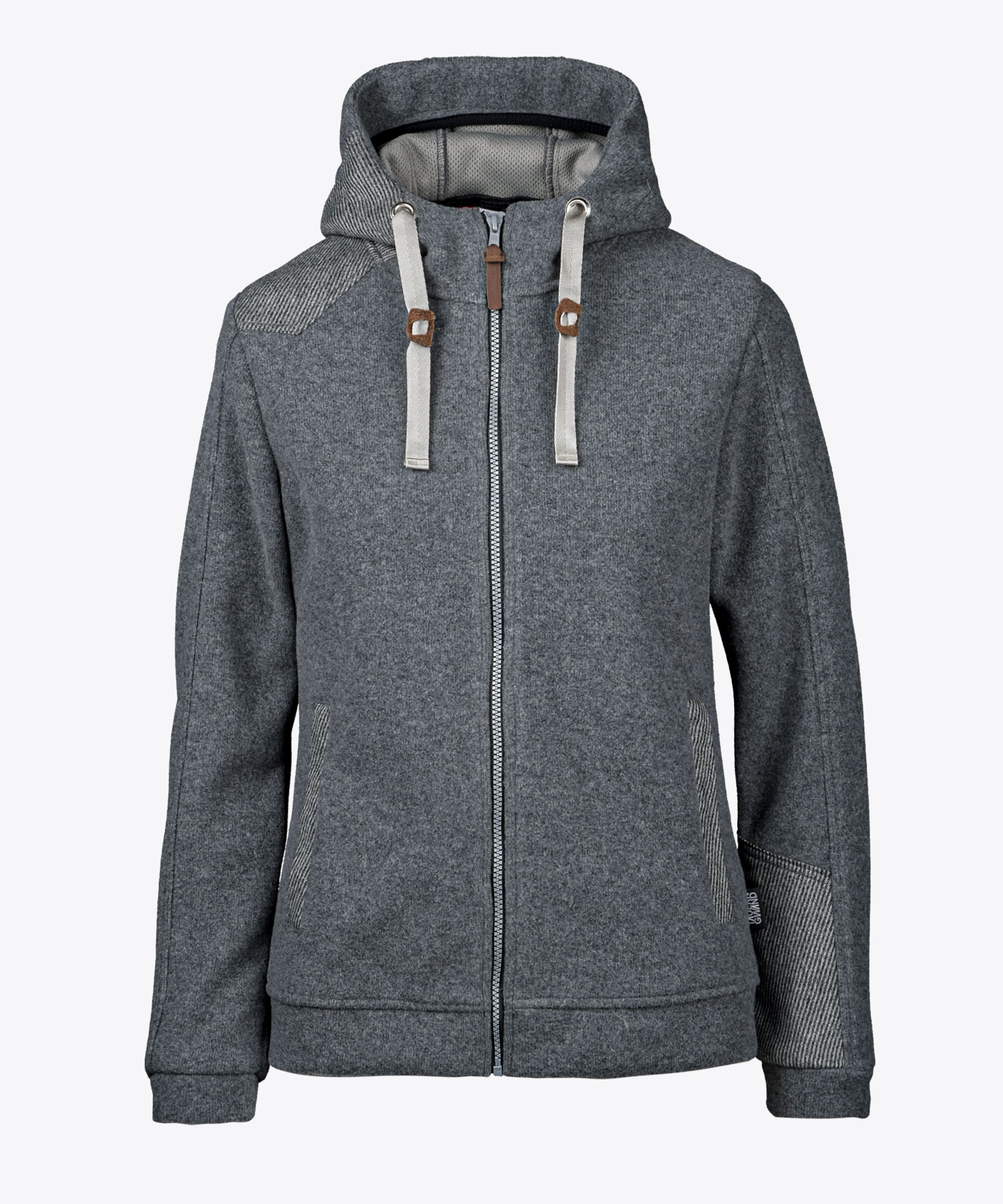 Walkjacke in Wollmischung, doppelseitiger Strick mit recyceltem Wollanteil an der Außenseite / Mesh-Struktur auf der Rückseite; Kontrasteinsätze in Schurwolle; seitlich verdeckte Taschenzippeingriffe; angeschnittene Kapuze mit Kordelband-Verstellmöglichkeit; abnehmbare Echtleder-Details an Frontzipp und Kapuze; ungefüttert