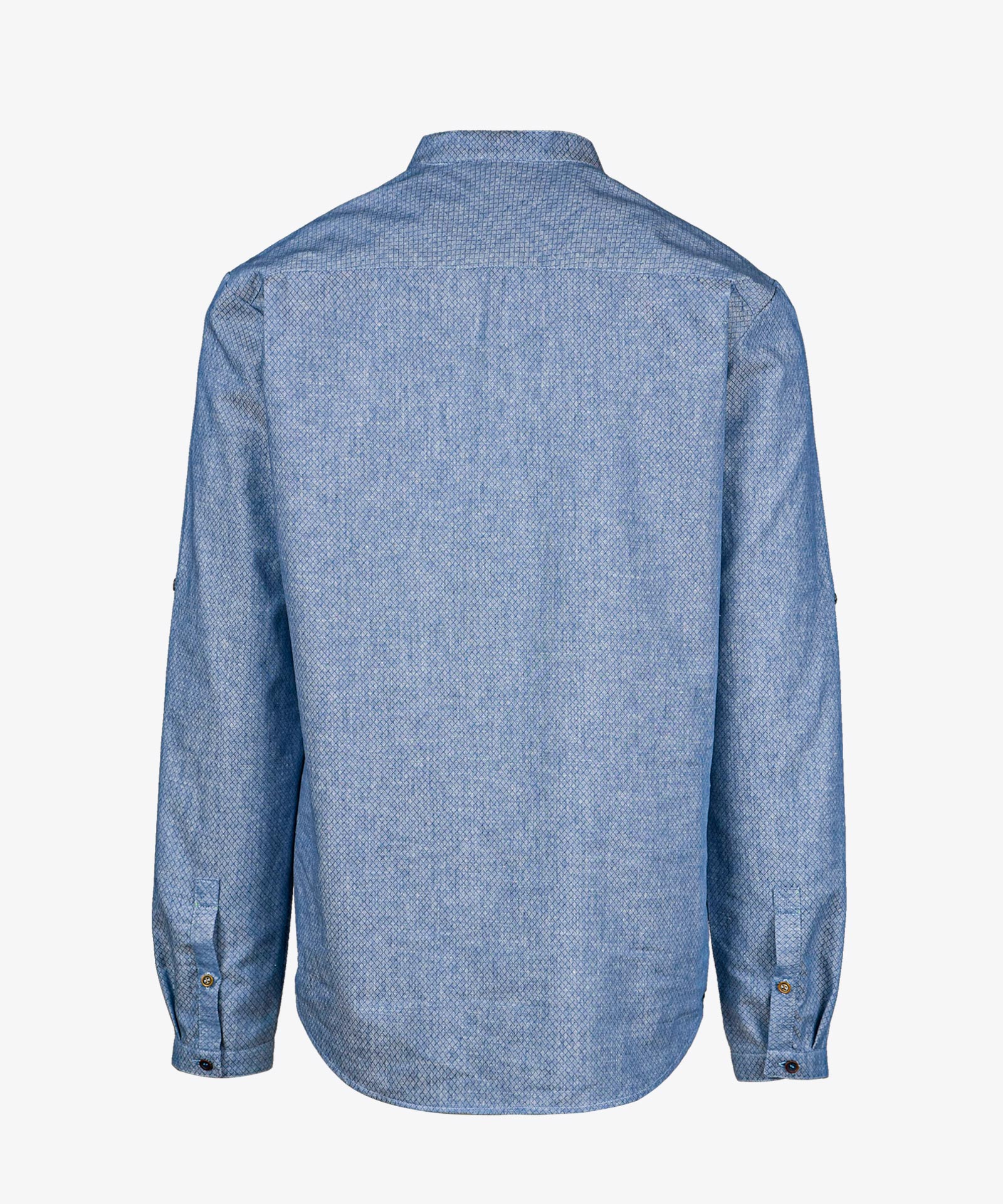 Hanffaser-Qualität in Rautendesign; verkürzte Knopfleiste; gerundeter Saumabschluss; Herren mit Feststellmöglichkeit zum Hochstülpen der Ärmellänge; Stehkragen Material: 70% Baumwolle, 30% Hanf