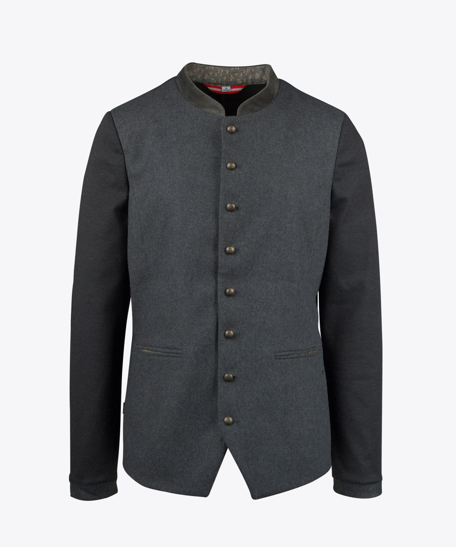 Hochgeschlossene Blazerjacke im Materialmix mit leicht elastischem meliertem Lodenstoff am Vorderteil und hochelastischer Wirkware an Rücken und Ärmeln; Samtstoff-Akzente an Stehkragen außen und Tascheneingriffen; Metallknopfverschluss; Vorderteil gefüttert