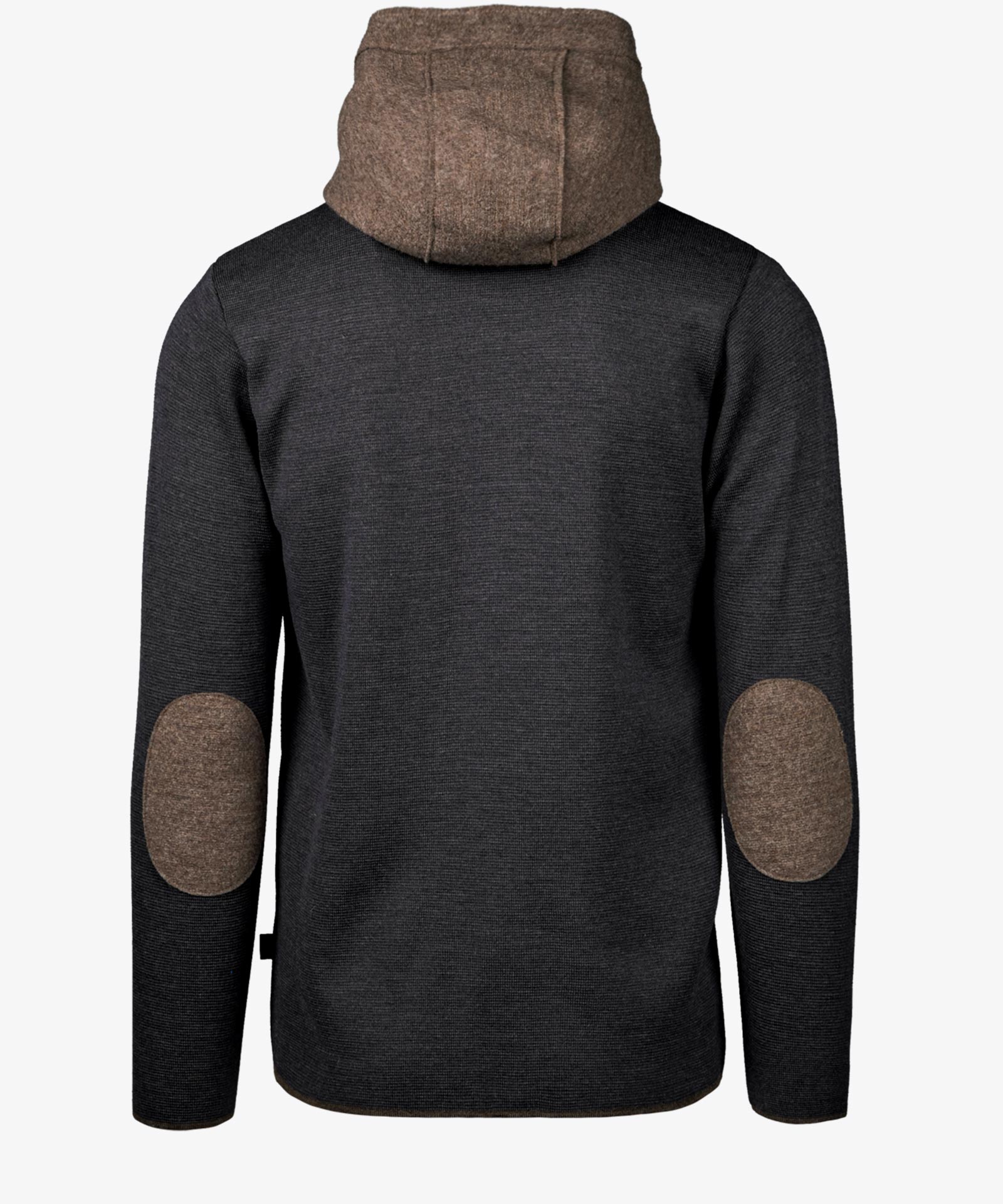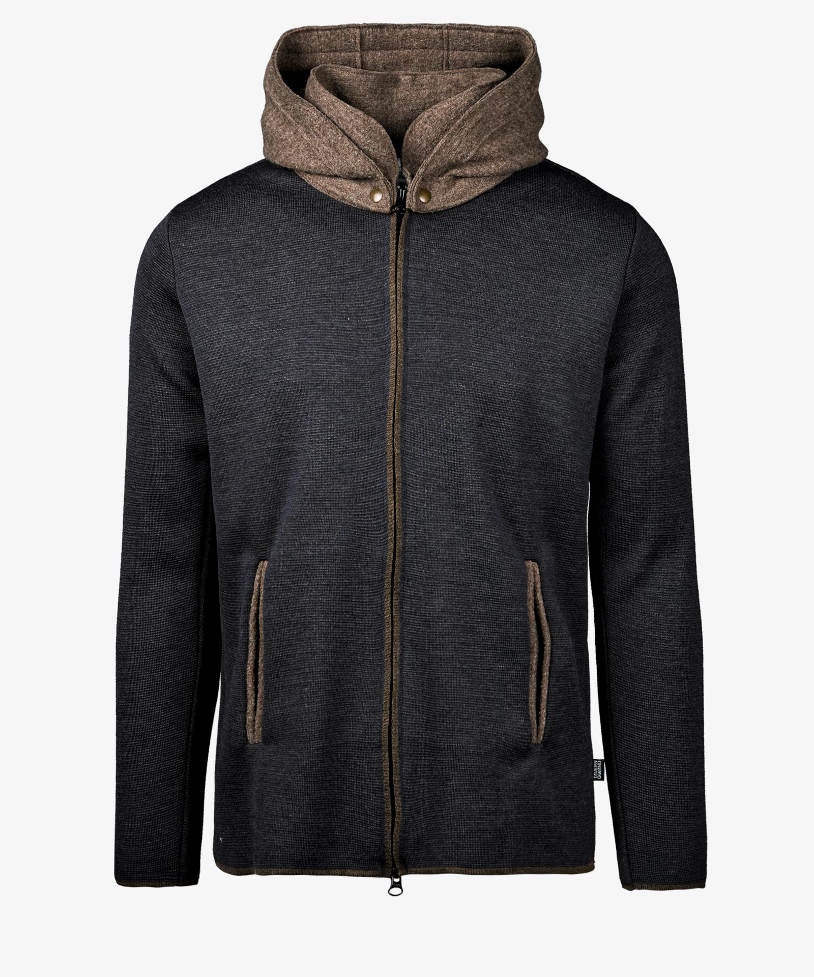 Feiner Wollstrick mit Walkstoff in Kontrast kombiniert; abnehmbare Kapuze; Zwei-Wege-Zipp am Frontverschluss; offene Tascheneingriffe