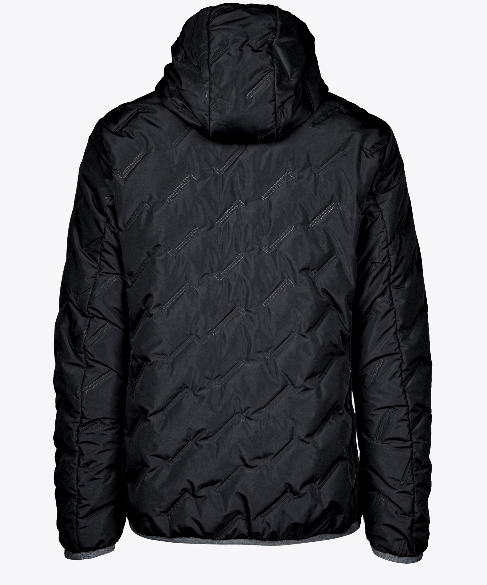 Leicht wattierte Jacke mit Steppeffekt; geschweißte Kammerkonstruktion mit Isolation aus Kunstfaser; seitliches Kontrastmaterial in bi-elastischer Knitshell-Qualität für Bewegungsfreiheit; angeschnittene Kapuze; Elastikeinfassung an Saum, Ärmelabschluss und an der Kapuzenöffnung; zwei Zipptaschen