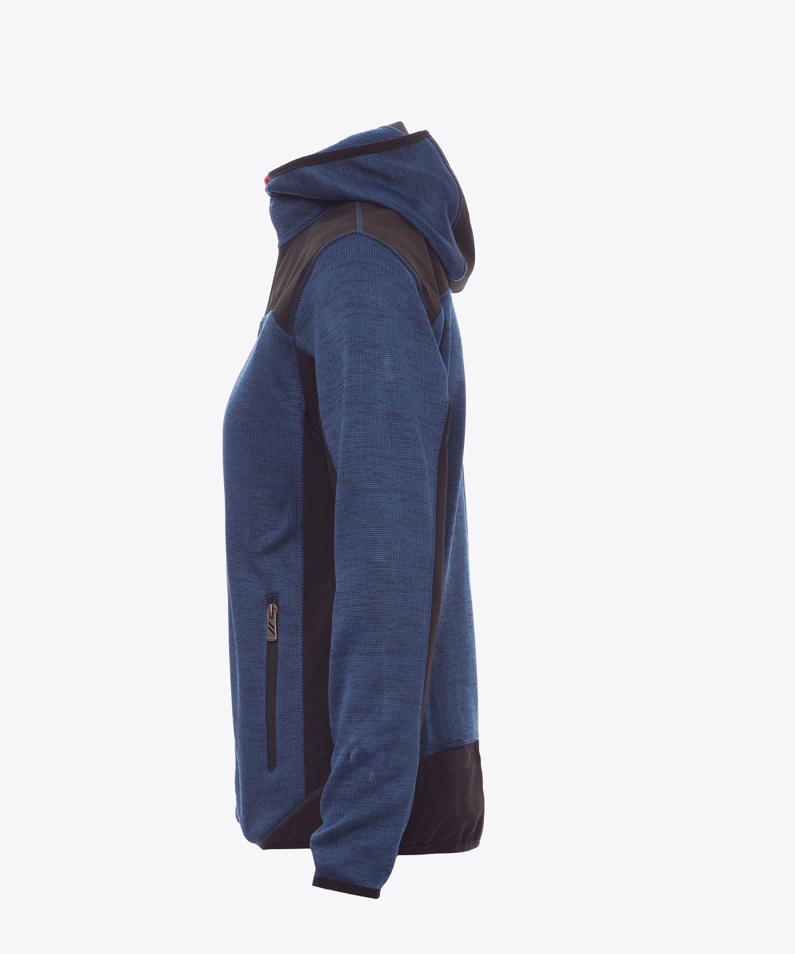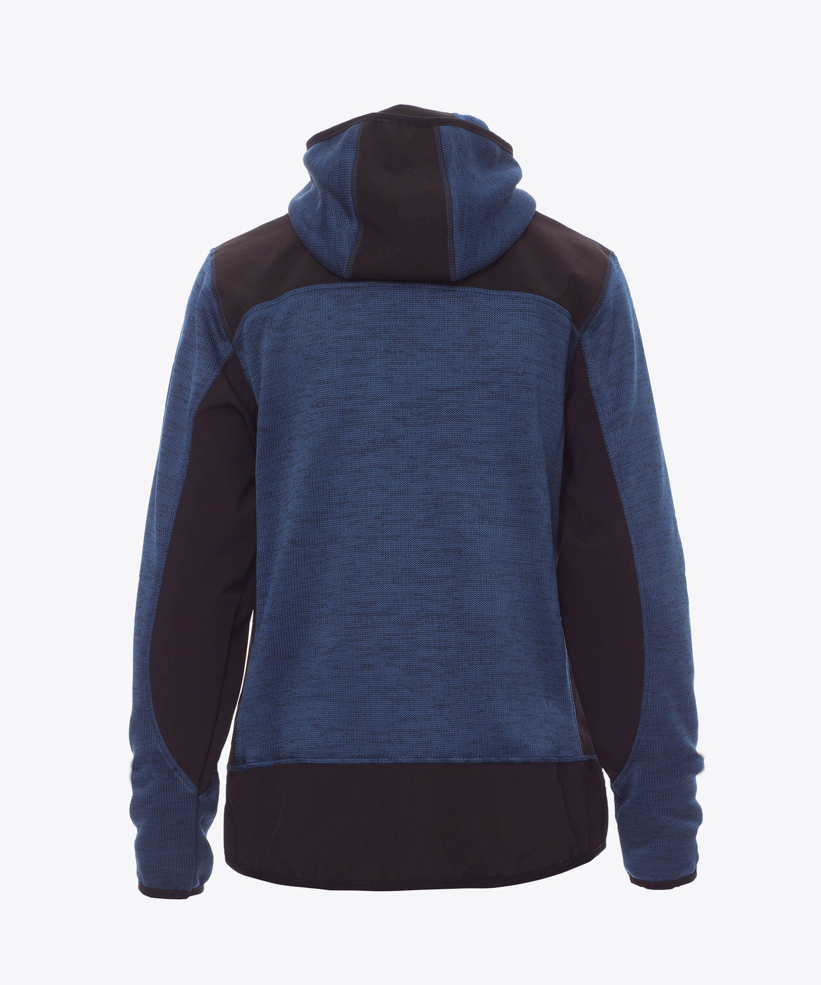 Technische Strickjacke mit schwarzen Softshell-Einsätzen, zweifarbig, versiegelter SBS-Reißverschluss, vorgeformter Kapuze mit zwei Nähten, feinem Saum an Handgelenk und Taille, zwei Seitentaschen mit