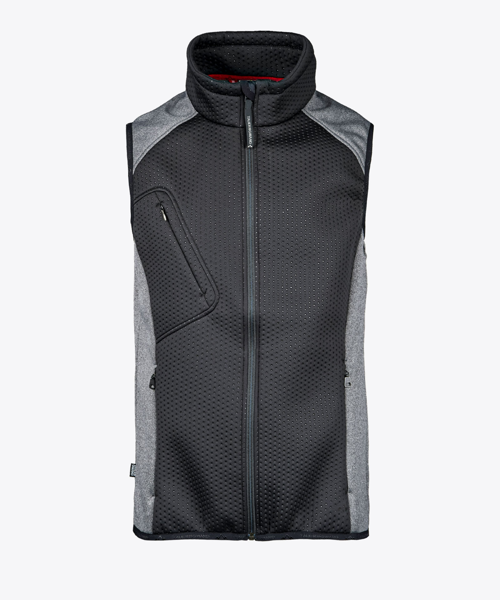 Sportlich-elegante Weste in Materialmix; Knitshell-Materialkombination an Rumpfbereich und Stehkragen mit Ultrasonic-Punktdesign; Schultern, seitliches Vorderteil und Rücken in Grau-Melange mit warmer angerauter Fleeceinnenseite; hochschließender Kragen; drei Nahtzipptaschen; Elastikeinfassung an Saum und Armabschluss; ungefüttert