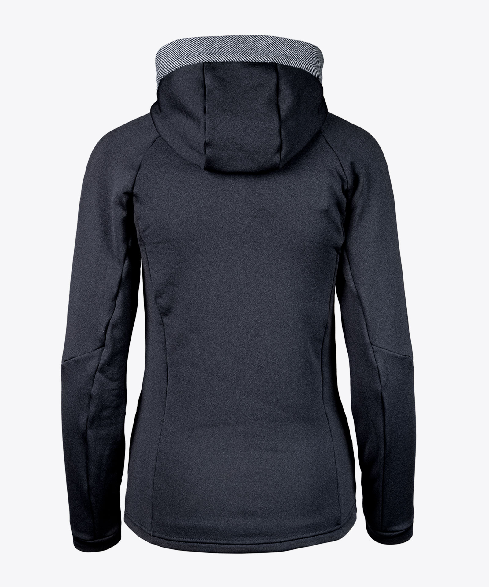 Angenehm weiches Tragegefühl in hochwertiger 4-Wege-Tecno-Stretch-Fleecequalität mit hoher Bewegungsfreiheit trotz figurbetonter Passform; glatte Oberfläche mit Mélange-Effekt, aufgeraute Innenseite, gute Wärmeisolation; Frontzipp und zwei Zipptaschen in Kontrastfarbe; angeschnittene Kapuze mit Kontraststoffeinfassung, optional für Wording-Logo-Druckgestaltung